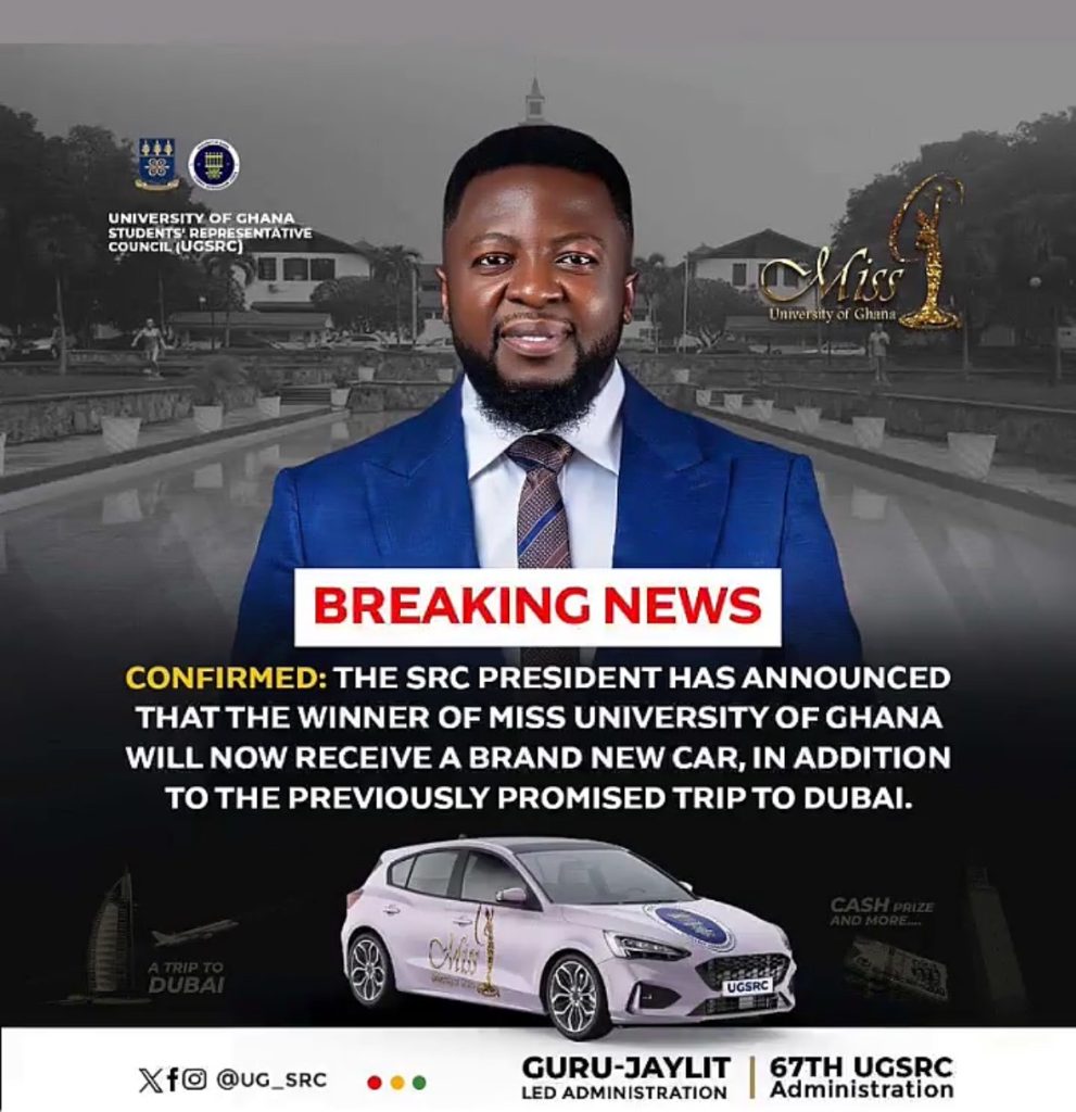 The University of Ghana is buzzing with excitement as the Student Representative Council (SRC) President has announced a game-changing addition to the Miss University of Ghana pageant. Forget just a crown and bragging rights, this year’s winner is driving away in style!