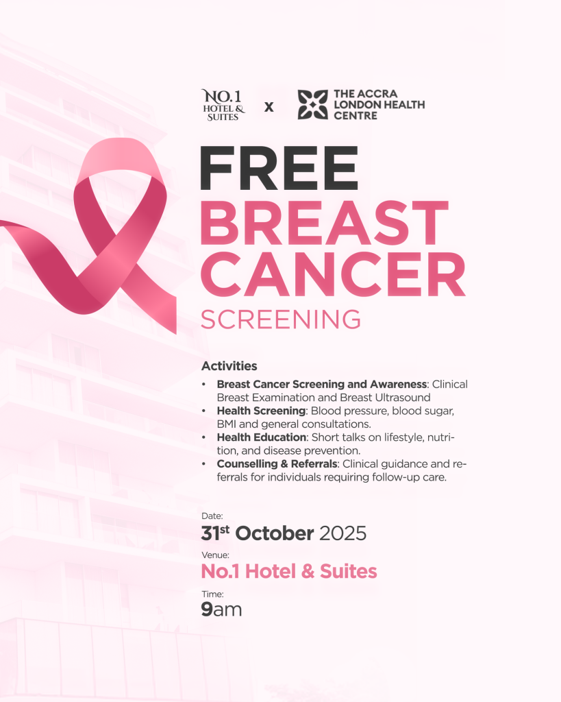As part of its annual Corporate Social Responsibility (CSR) initiative and in honour of Breast Cancer Awareness Month, Number One Oxford Street Hotel & Suites is joining forces with The Accra London Medical Centre to offer free breast cancer screening to the public.