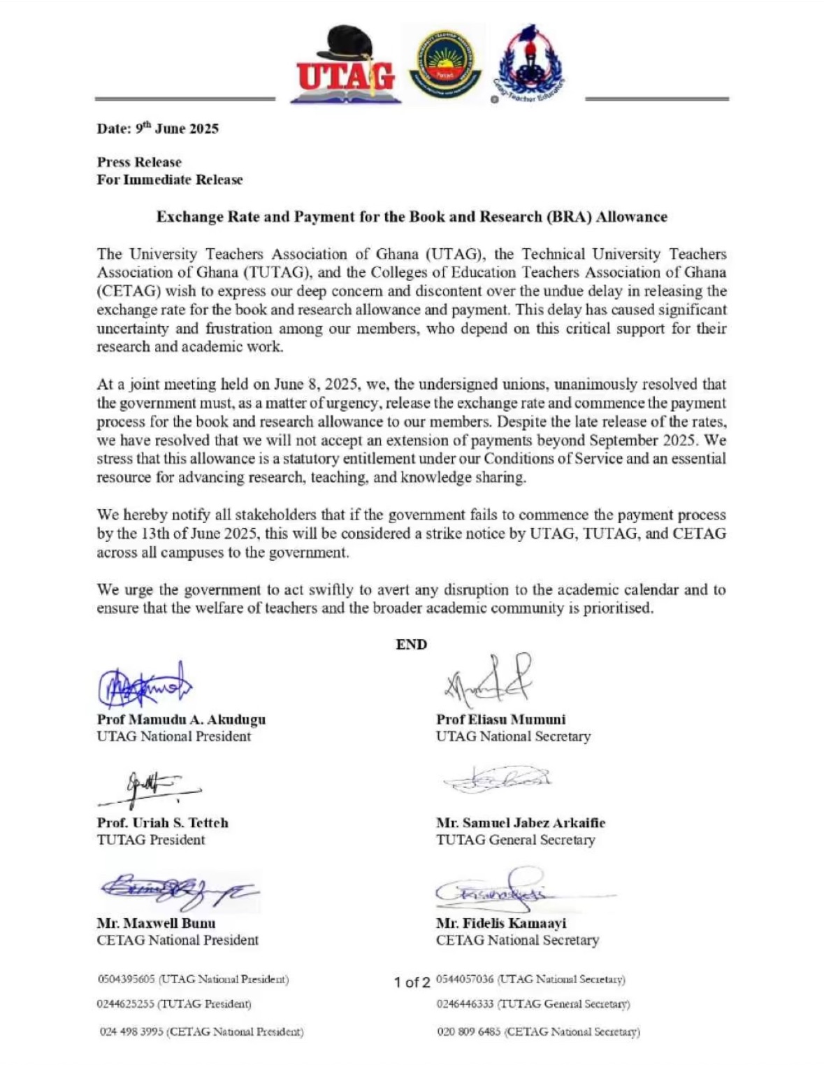 The associations are reminding the government that the book and research allowance is a statutory entitlement, as outlined in their Conditions of Service. They are also emphasizing its vital role in promoting research, enhancing teaching, and facilitating knowledge sharing within Ghana’s higher education sector. Failure to begin the payment process by June 13, 2025, will result in a nationwide strike across all campuses by UTAG, TUTAG, and CETAG. The associations are urging the government to take swift action to prevent academic disruptions and prioritize the well-being of educators and the broader academic community.